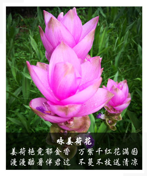 姜荷花因其花序亭亭玉立,粉红色苞片外形似荷花而被命名,同时又因其原产热带,花朵外形似郁金香而被称为“热带郁金香”。多年生球根草本花卉。株高30~80厘米,花径通常高于叶片。地下有纺锤形或圆球形根茎,球茎上有两排对生的芽,芽的生长有偏向一侧的习性,可连续产生多个,但春季种植后,通常先萌发第一个第一代芽,此芽常有5~7片叶,以后生长的芽只有3~4片叶。
